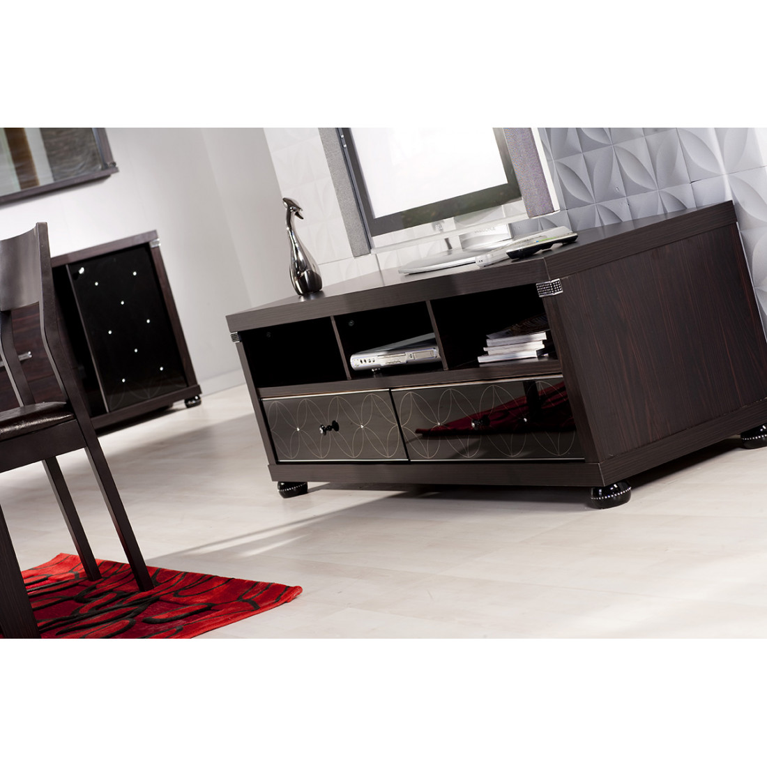 Тумба под телевизор MIRA-07 (венге) серии Мира от Беллона обладает лаконичной конструкцией, современной удлиненной формой и респектабельным дизайном. Эффектности модели добавляет стильное оформление боковых распашных створок из каленого черного стекла – нанесенный стилизованный рисунок сопровождается украшением стразами Swarovski. Купить невысокую длинную тумбу под ТВ и аппаратуру в цвете венге предлагаем по акции сниженной цены.